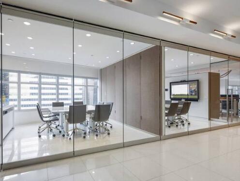 普通玻璃隔斷是我們在最常見到的一種辦公室裝修隔斷方式,而玻璃隔斷的優(yōu)點也很明顯,可以讓辦公室顯得更加寬敞、明亮,而且也有著環(huán)保、裝修速度快的優(yōu)點,但在隔音效果上相對較差一些。