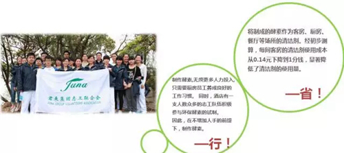 該飯店總經(jīng)理曹蘭蘭說(shuō):“原來(lái)我們用清潔劑清潔客房,平均下來(lái)每一間房間花費(fèi)0.14元,現(xiàn)在用了酵素后下降到了0.01元?!痹瓉?lái),酵素是一種酶,具有凈化和抗菌的功能。無(wú)錫君來(lái)湖濱飯店以每天用剩的大量的果皮和蔬菜為原料,加上黑糖或者紅糖制作成酵素清潔劑,應(yīng)用在客房、公共區(qū)域衛(wèi)生間、廚房、地面、墻磚的清潔上,既衛(wèi)生又環(huán)保?!斑@種變廢為寶,不僅減少了垃圾的排放,還為飯店節(jié)省了大量清潔費(fèi)用,這一飯店環(huán)保節(jié)支的新嘗試值得我們學(xué)習(xí)?!倍辔慌c會(huì)嘉賓表示。